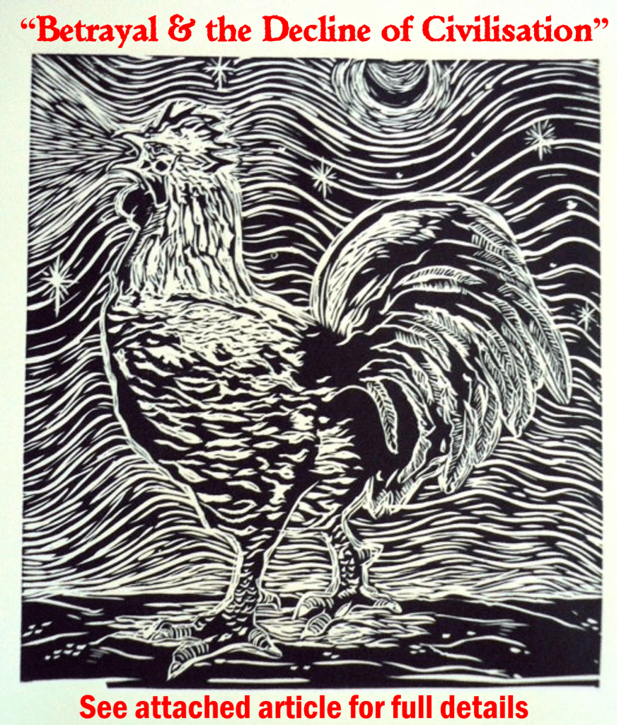 Betrayal is a denial of the humanity of the other. It is a form of homicide, even genocide if unchecked. It is certainly no coincidence that a kiss — an ironic axis upon which the future outcome of this cosmos was hinged — was instrumental in the betrayal of the Christ to the authorities and to his death, and for a paltry thirty pieces of silver (the equivalent today of about $200). The very name “Judas” has become synonymous with the act of betrayal. Let us also not forget the betrayal by (the afterwards penitent) Peter, foretold by the Christ with the words, “Before the cock crows twice, you will deny me three times” — a terrible warning about infidelity to one’s friends, to truth, to the Light, and to the Source of all life. In keeping with this, the decline of any civilisation will be generously peppered with, and rooted in, betrayal. For degeneracy and corruption in human affairs will inevitably spawn it. Consequently, we can see betrayal all around us now as this idolatrous, materialist, narcissistic “civilisation” inevitably implodes and self-destructs.