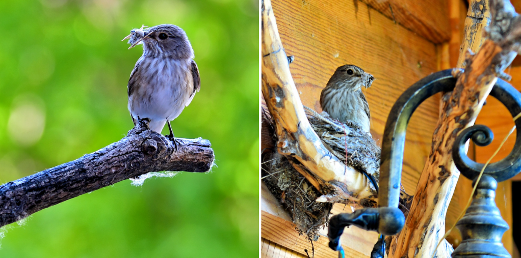 However, I did make a bit of headway yesterday with a Spotted Flycatcher, which must have just arrived with the warm weather in its migration from South Africa. I noticed it perched nervously on a twig with a beakful of material for a nest, while eyeing me up to see if I am hostile (see photo, left, above). It was watching me to see if I would go away so it could carry on with the job, as they obviously do not like to give away the location to potential predators. (I say “it” because I was not entirely sure whether it was the male or female as both genders can engage in nest-building, though apparently with Spotted Flycatchers it is the female who does most of the work!). Only thing is… it is building the nest on the front of the mountain cabin in which I’m currently staying, right above the light next to my front door! So, we share real estate and it would have to get used to me. As I hunkered down nearby with my camera, the bird came closer and closer to the semi-constructed nest. I kept issuing verbal assurances about my peace-loving pedigree and maybe I convinced it as, eventually (after about 10 minutes of this dance, with it coming nearer then going away a bit, then coming even nearer still), it finally got on the nest to continue construction — all the time watching me with its beady eye (see photo, right, above).
