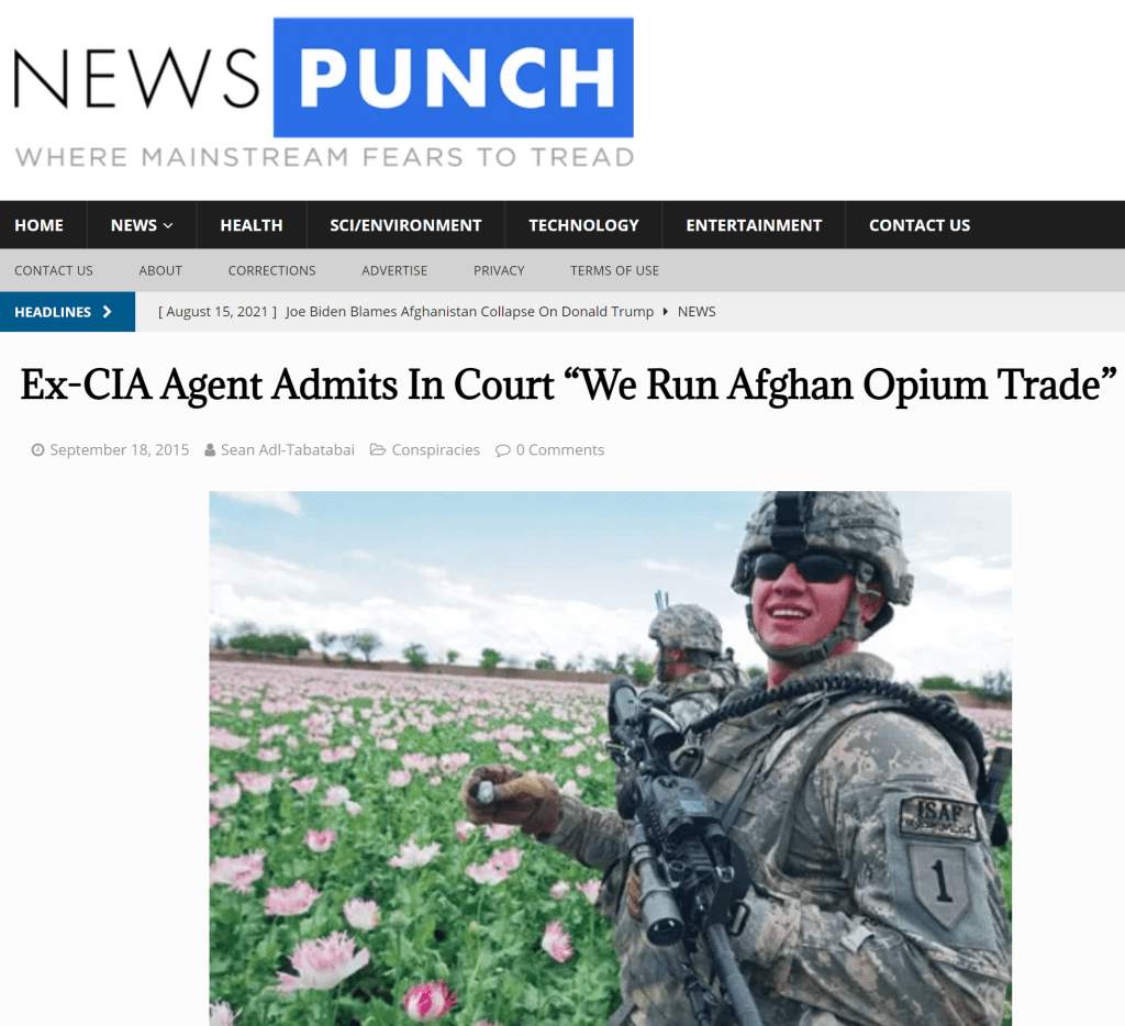 YOU WILL NEVER UNDERSTAND THE SITUATION IN AFGHANISTAN until you grasp the fact that the US instigation of upheavals and wars around the world have never had anything to do with “policing the planet” or “generating democracy” but are all about who controls drug production and distribution. This is the case whether it involves poppy-fields in South-East Asia and Afghanistan, or coca plantations in Central America. Behind it all is the CIA as enforcement operator, working hand in glove with international crime syndicates in the production and distribution of heroin and cocaine, as it both finances its hugely expensive black operations and keeps a significant part of society in the grip of debilitating and evil substances. The CIA even destabilised the 1960s anti-war movement by the mass distribution of LSD so that it morphed into the passive, dopey “Love ‘n Peace, man” hippie scene! There is more…
